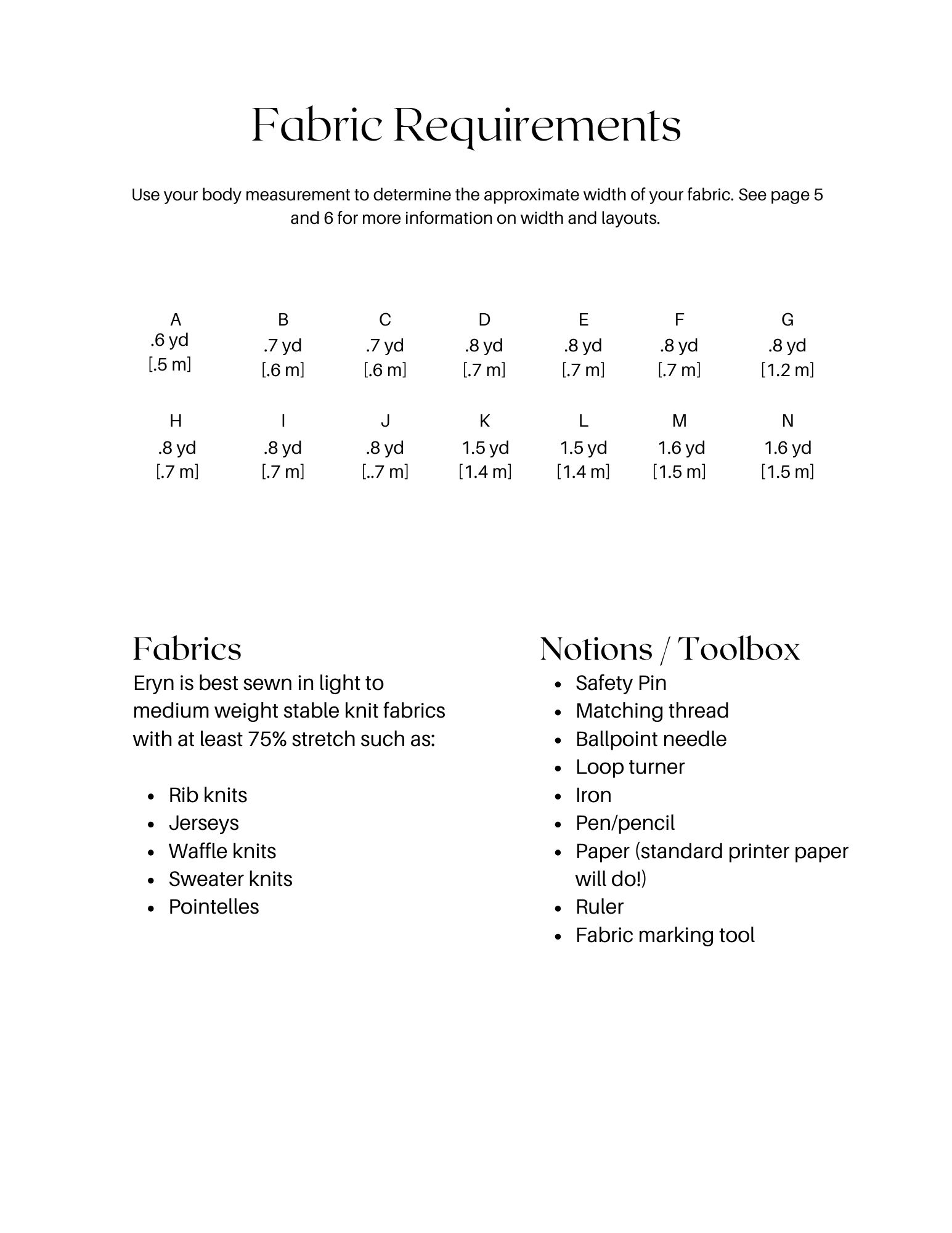 Eryn is best sewn in light to medium weight stable knit fabrics with at least 75% stretch such as: